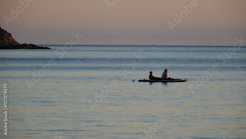 Naklejka premium Sunset on the Côte d'Azur with people on paddle enjoying the sea