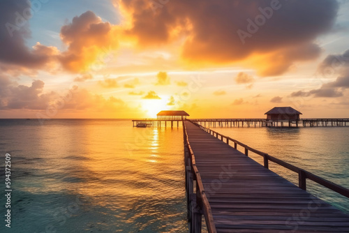 Fototapeta premium Sunset on the island of Maldives at a resort. Generative AI