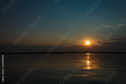 © Roman, Naklejka premium Sunset on the lake. Evening sky with beautiful clouds is reflected in the water of the lake
