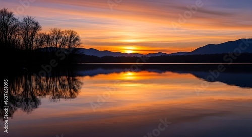 © Kaveesha, Fototapeta premium sunset on the lake Reflecting Colorful Skies with Tree Silhouettes and Distant Mountains