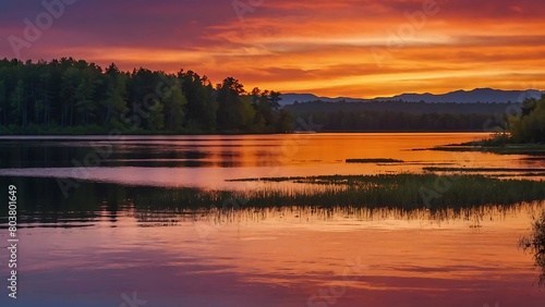 © Dove, Fototapeta premium sunset on the lake Serenity's Embrace Tranquil Sunset Reflections