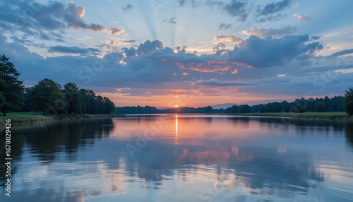 © Ghayoor, Fototapeta premium sunset on the lake sunset over the lake beautiful view and seen beautiful background and wallpaper hd picture