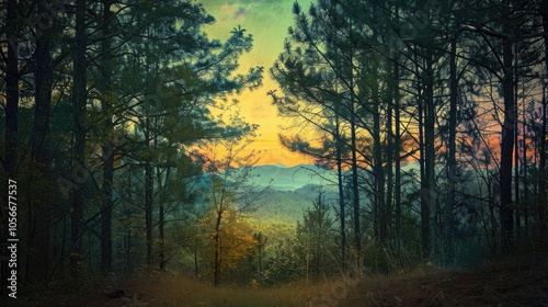 © GenZGraphics, Obraz premium Sunset On The Mountain Through The Trees