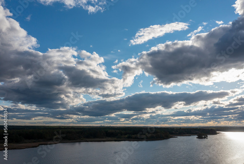 © Sergii Sanich, Fototapeta premium sunset on the river against a dramatic cloudy sky. The sun is reflected in the water. Drone photo