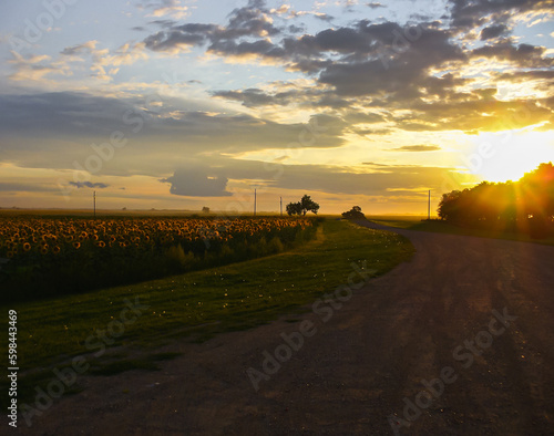 © Evgenii, Fototapeta premium Sunset on the road and sunflowers. North Dakota.