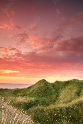 Obraz premium Sunset on the west coast of Jutland - Lokken Beach, Denmark. Beautiful landscape with lush grass waving in the wind during sunset or over a ocean with red, orange, blue, and yellow colors in the sky