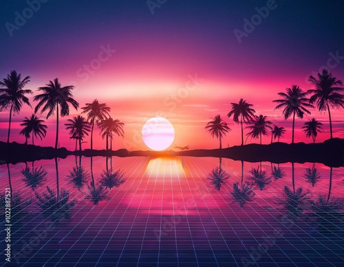 © MdRakibul, Naklejka premium Sunset on tropical island sea beach panorama, ocean sunrise panoramic landscape