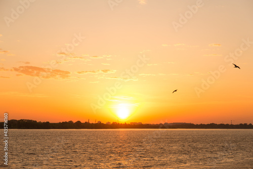 © Julia Kiseleva, Naklejka premium Sunset or sunrise on the river embankment at summer evening