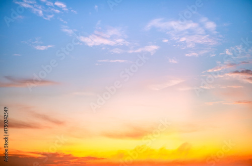 Naklejka premium Sunset or sunrise sky with a vibrant gradient of orange, gold, and soft blue. Clear atmosphere with wispy clouds. Peaceful, natural light background. hope, freedom, new day and inspirational Concepts