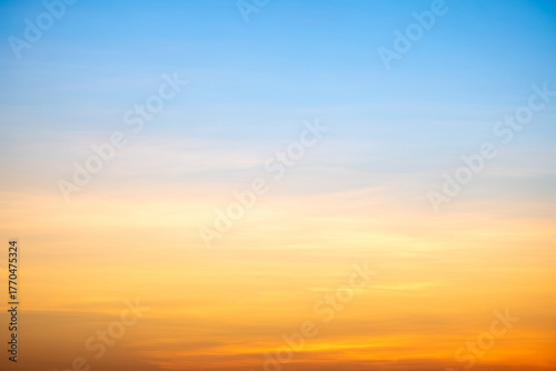 © ISENGARD, Obraz premium Sunset or sunrise sky with a vibrant gradient of orange, gold, and soft blue. Clear atmosphere with wispy clouds. Peaceful, natural light background. hope, freedom, new day and inspirational Concepts