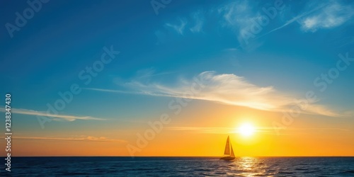 Obraz premium Sunset over a blue ocean with a sailboat gliding across the surface, horizon,...