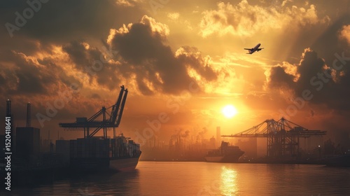 © akun, Obraz premium Sunset over a busy port with cargo ships, cranes, and a plane taking off