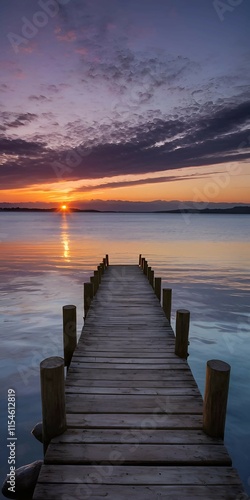 Fototapeta premium Sunset over a Calm Lake with a Wooden Pier