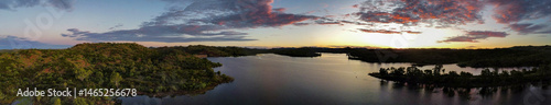 © Patrick, Fototapeta premium Sunset over a calm lake with mountains in the background, seen from above