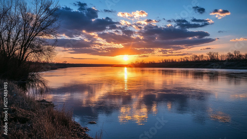 Fototapeta premium Sunset over a calm river, with vibrant orange and yellow hues reflecting on...