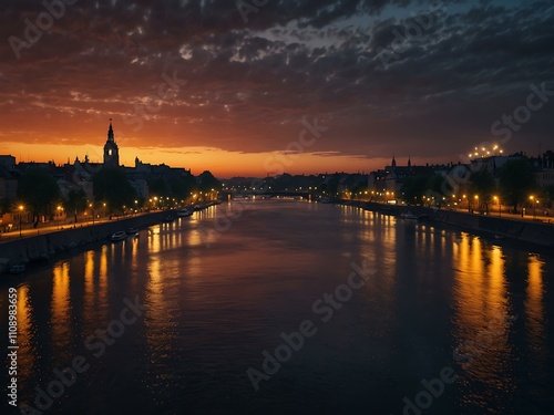 © claudunia, Fototapeta premium Sunset over a city river, reflecting shimmering lights.
