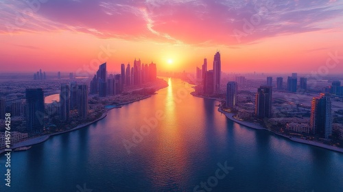 © delvin std, Fototapeta premium Sunset over a city skyline and river.