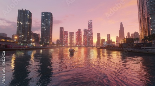 © wisnuromad art, Fototapeta premium Sunset over a city skyline reflecting in water.