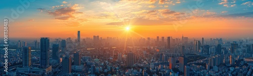 Fototapeta premium Sunset over a city with tall buildings and a river, banner, copy space
