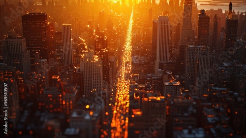 Obraz premium Sunset over a cityscape, with warm golden light reflecting off skyscrapers and the streets below.