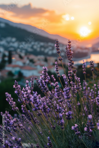 Naklejka premium Sunset over a field of blooming lavender flowers
