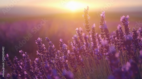 © harryaishi, Naklejka premium Sunset over a field of lavender flowers.