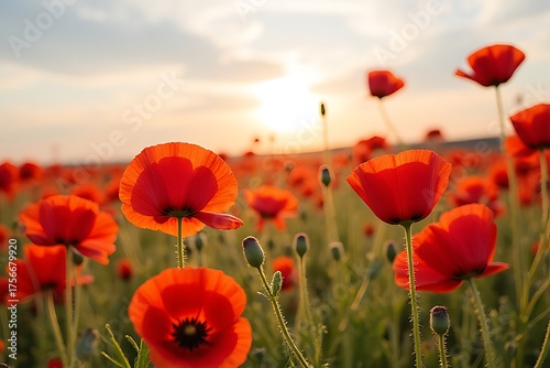 Fototapeta premium Sunset over a field of red poppies creating a warm and peaceful scene