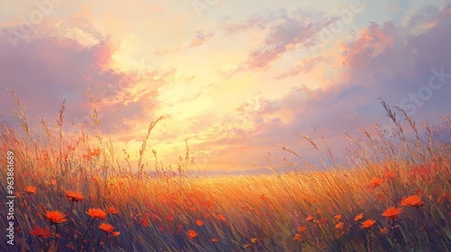 © IMAGINIAC, Fototapeta premium Sunset Over a Field of Tall Grass and Wildflowers