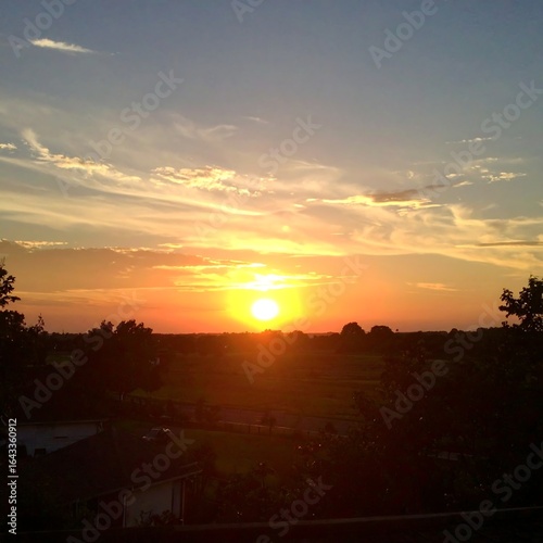 © Arif, Naklejka premium Sunset over a flat landscape, silhouetting trees and houses