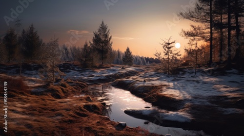 © Egriva, Fototapeta premium Sunset over a frozen stream in a snowy forest