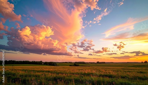 © Daun, Obraz premium Sunset over a grassy field with dramatic clouds