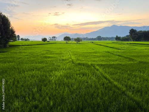 Obraz premium Sunset Over a Green Paddy Field in the Countryside