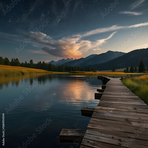 © Haseeb Akhtar, Fototapeta premium Sunset over a lake with a wooden bridge and pier reflected in the water