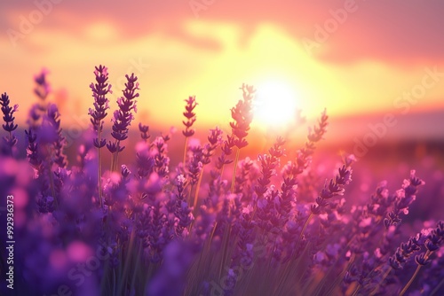 Naklejka premium Sunset over a lavender field, the blooms glowing purple, surrounded by a softly glowing sky