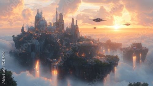 Fototapeta premium Sunset over a majestic, futuristic city floating among clouds, with flying...