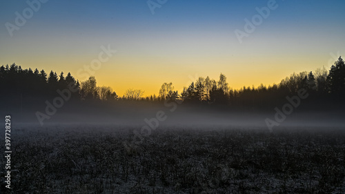 © Jonas, Obraz premium sunset over a misty field in Sweden