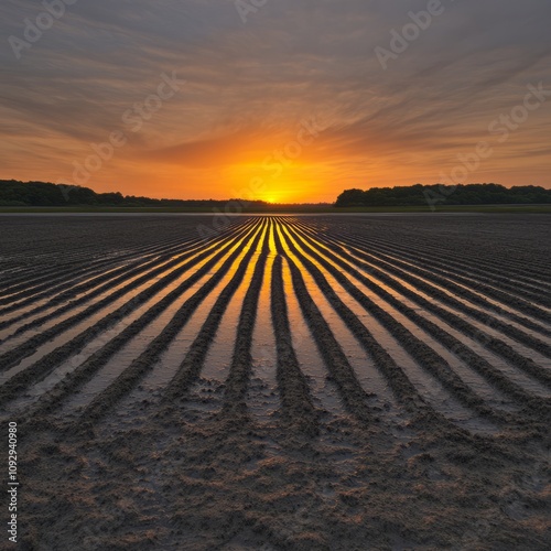 © Big9869, Fototapeta premium Sunset over a plowed field with water reflecting the sun.