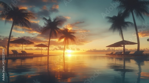 Obraz premium Sunset over a pool, with palm trees and beach umbrellas. Soft light reflects...