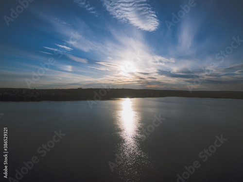 © andriikomashko, Fototapeta premium Sunset over a river with forest on a horizon. Almost dusk.