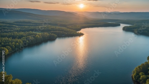 © Sona, Fototapeta premium Sunset over a river with forested banks and distant mountains.