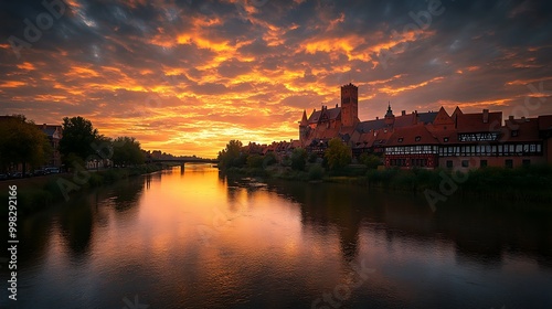 © ardanz, Obraz premium Sunset over a river with historic buildings.