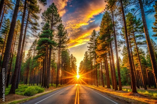 © Arnada, Obraz premium Sunset Over a Road in Pine Forest - Magical Golden Light Panoramic Photography
