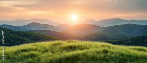 © Naret, Fototapeta premium Sunset over a rolling hills landscape, minimalistic shapes with space for text