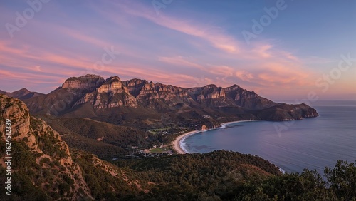 © AkuAku, Fototapeta premium Sunset over a rugged mountain and hill scenery by the water