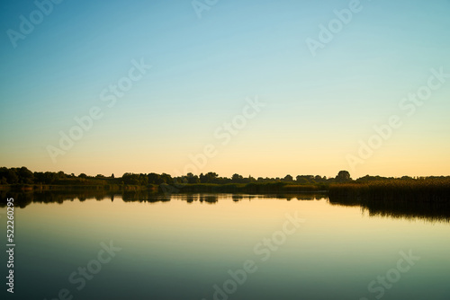 © Igor, Fototapeta premium Sunset over a rural river with a blue sky in the background