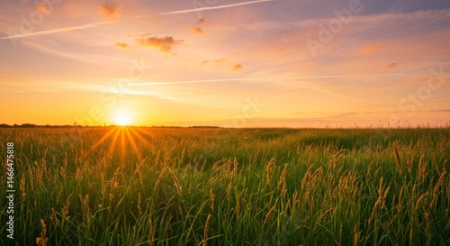 © AleniaFlow, Fototapeta premium Sunset over a Serene Green Field