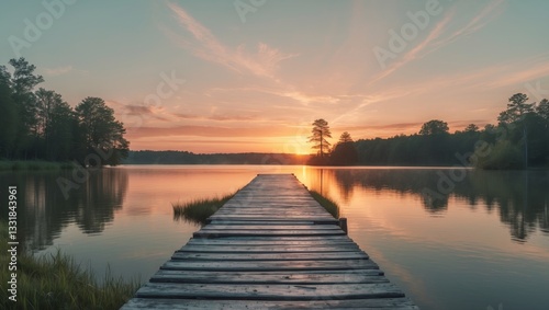 © Ta Sher, Obraz premium Sunset over a Serene Lake with a Wooden Dock.