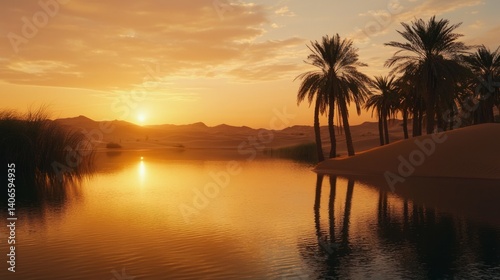© Jakkarin, Obraz premium Sunset Over a Serene Oasis in the Middle East Desert Landscape