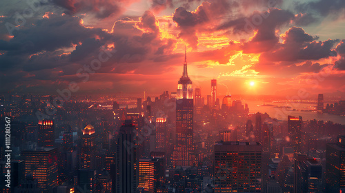 Fototapeta premium Sunset Over a Steampunk Cityscape: A Vibrant Fusion of Futuristic Architecture and Classic Design, Embraced by a Warm Golden Glow at Dawn