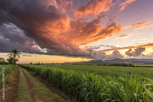 Obraz premium Sunset Over a Sugarcane Field in a Rural Landscape With Clouds and Mountains